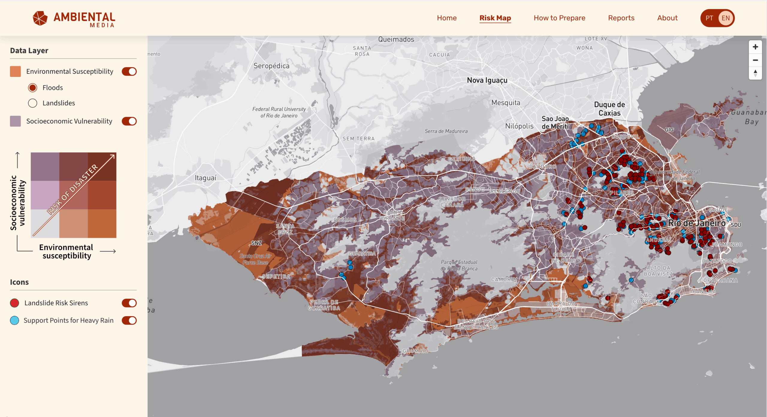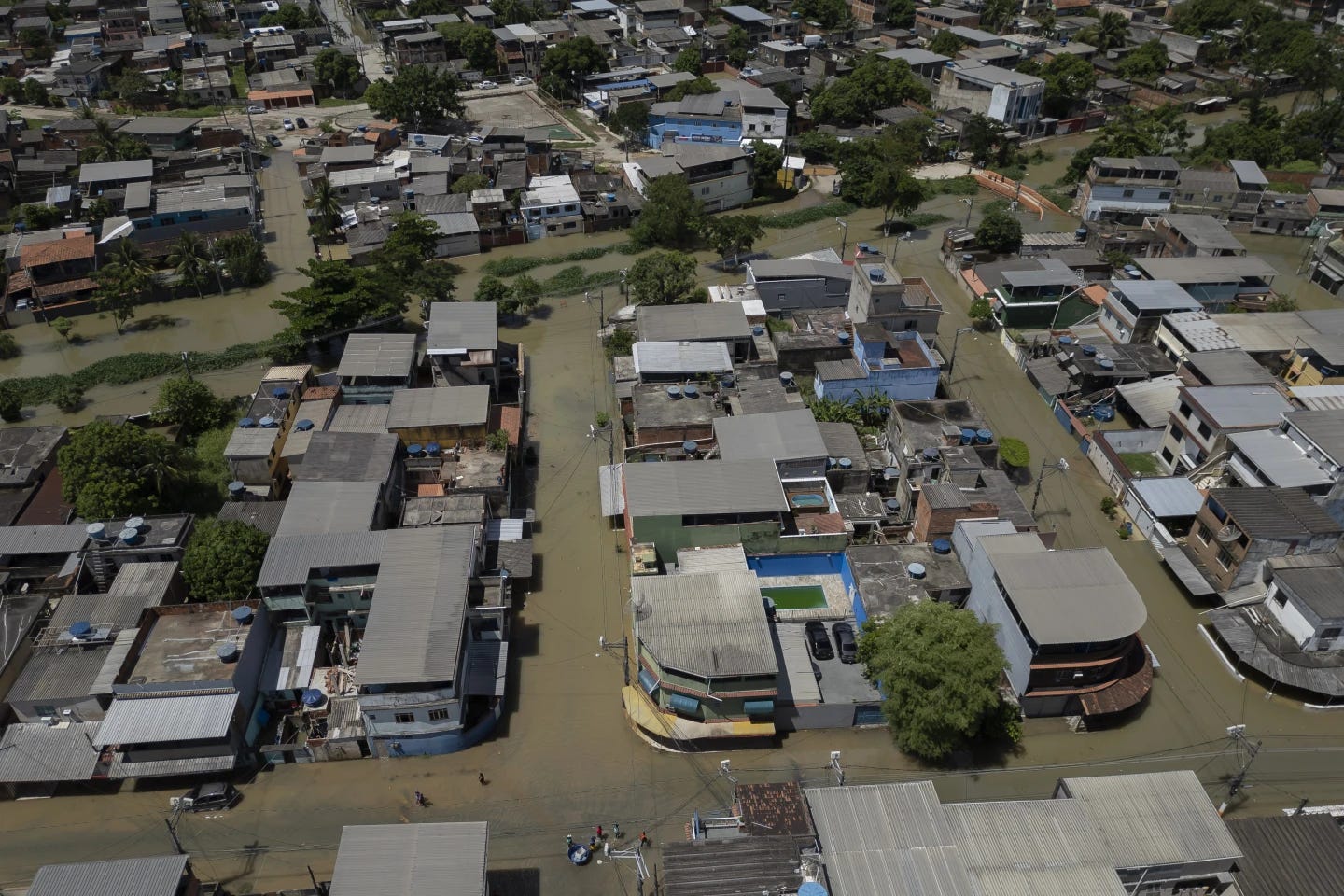 根据Ambiental Media制作的地图,该城面临最大洪涝风险的地区是Jacarepaguá Lagoon Complex。这片山水之间的瀉湖地带是奥运村的所在地,吸引了65万人定居。无法让水下渗的城市地面和狭窄的铺装湖底、河道导致雨水很容易在顺山而下后淤积在这里。而该地的地产开发还在继续,建筑工人处在尤其大的风险中,因为他们的住所往往就在自己参与修建的中上层阶级住宅周围。Jacarepaguá 地区已经形成了里约第二大的贫民窟 Rio das Pedras。
